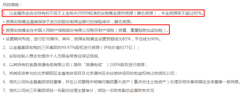 看看风控措施:实物黄金质押+三环集团估值77亿股权质押+实控人连带责任担保加土地收益权转让+信托公司监督,这么多项风控至少数量上是少见的。