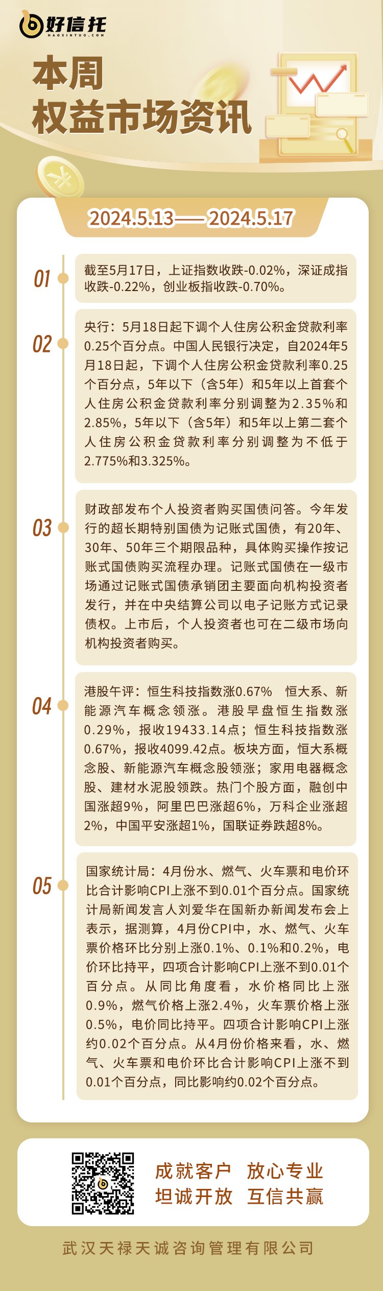 1、港股内房股持续拉升,融创中国涨超18%。5月17日消息,港股内房股午后震荡拉升,截至发稿,雅居乐集团、融创中国涨超18%,万科企业涨近16%,远洋集团涨超10%。消息面上,中国人民银行发布关于调整商业性个人住房贷款利率政策的通知。其中提到,取消全国层面首套住房和二套住房商业性个人住房贷款利率政策下限;5月18日起,下调个人住房公积金贷款利率0.25个百分点。中国人民银行、国家金融监督管理总局发布通知,首套房商贷最低首付比例调整为不低于15%,二套房商贷最低首付比例调整为不低于25%。