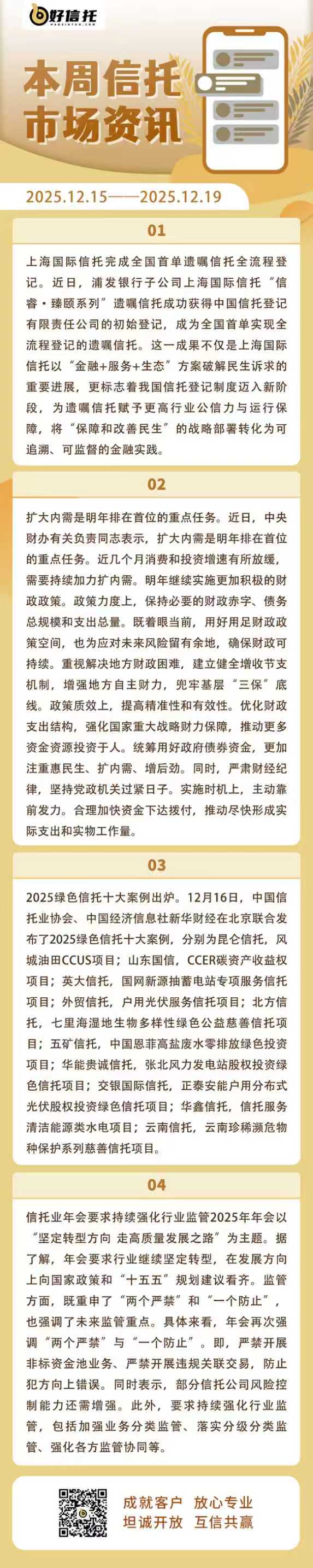 1、财政部拟第一次续发行2025年记账式附息(二十三期)国债竞争性招标面值总额970亿元。财政部拟第一次续发行2025年记账式附息(二十三期)国债。本次续发行国债为3年期固定利率附息债。本次续发行国债竞争性招标面值总额970亿元,进行甲类成员追加投标。本次续发行国债票面利率与之前发行的同期国债相同,为1.40%。招标时间为2025年12月19日上午10:35至11:35。
