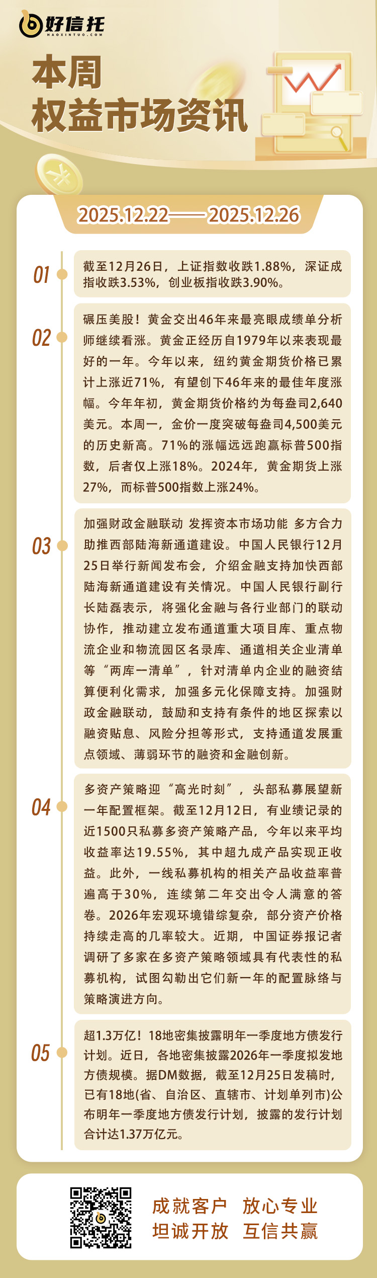 3、上交所发布专项指南债券受托业务“转舵”主动信用管理,多家试点券商实践案例已落地。12月24日,上交所发布《上海证券交易所债券存续期业务指南第5号——公司债券受托管理》,积极引导受托管理人发挥主动信用管理功能。《指南》首次将信用管理的理念贯穿债券产品的全生命周期,再次强调了公司债券以信用为生命线的特征,还设专章鼓励支持主动信用管理工作,引领受托管理人角色转变,带来行业新气象,同时细化了券商在受托业务实践中信用监测、信息披露、持有人会议等工作环节。方案,这笔20亿元的中票本金兑付时间展期12个月,调整后兑付时间为2026年12月15日,届时将偿付这笔中票全部本金。