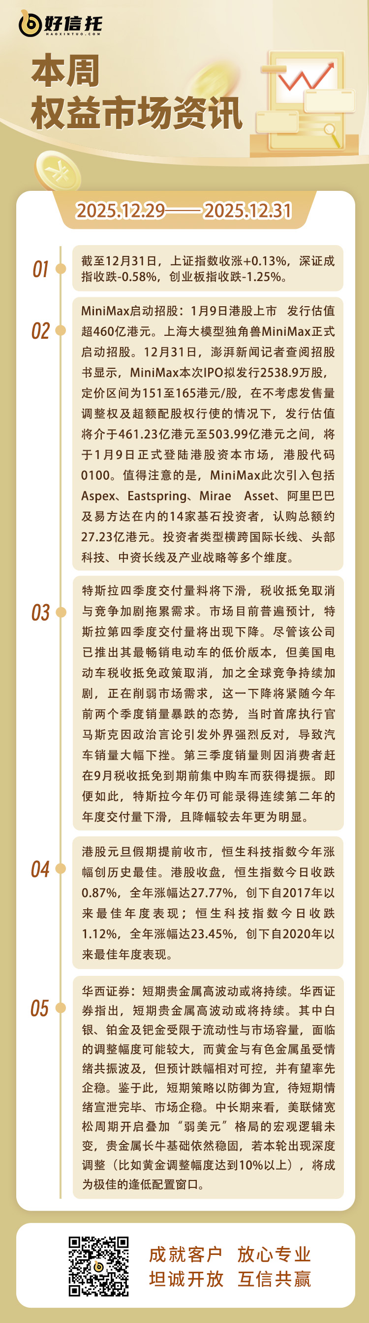 2、港股三大指数上涨,科技股领跑百度大涨近9%。12月30日,港股三大指数齐涨,恒生科技指数收涨1.74%。权重科技股集体走强,百度劲升近9%,半导体、机器人、石油板块同步活跃。6只新股上市多数收涨。机构重申看好网易、哔哩哔哩及优必选。展望后市,机构认为2026年港股将受益于资金面与企业盈利改善,建议聚焦科技、周期及消费的结构性机会。