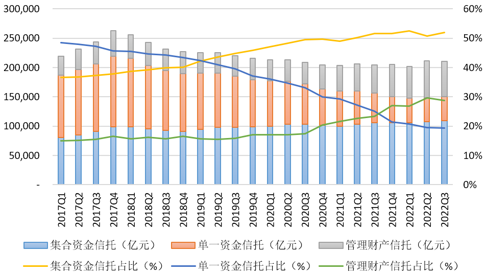 二是信托资产来源结构持续优化。2022年3季度,行业集合资金信托持续增长,管理财产信托重回增长通道,单一资金信托持续下降,总体延续“两升一降”态势。其中,集合资金信托2022年3季度末规模为10.94万亿元,同比增长0.38万亿元,增幅3.63%;环比增长1.99%;较2021年末增长0.35亿元,增幅3.29%;占比达到51.90%,同比上升0.28个百分点。管理财产信托规模经过2017、2018年连续两年调整后,自2019年2季度开始重新进入持续增长通道,2022年3季度末规模为6.06万亿元,同比增长1.29万亿元,增幅27.01%;环比下降3.16%;较2021年末增长0.52万亿元,增幅9.30%;占比为28.75%,同比上升5.42个百分点。单一资金信托规模在2017年末达到峰值以后,在监管压降通道业务等政策引导下,规模和占比持续下降。2022年3季度末规模为4.08万亿元,同比下降1.04万亿元,降幅20.35%;环比下降1.25%;较2021年末下降0.34万亿元,降幅7.69%;占比为19.35%,同比下降5.69个百分点。